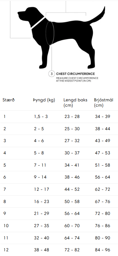 Athugið: Vaxað bómullarefni getur skroppið lítillega saman eftir þvott. Hafið þetta í huga við stærðarval. Ef hundurinn er á milli tveggja stærða mælum við með að velja stærri stærðina.