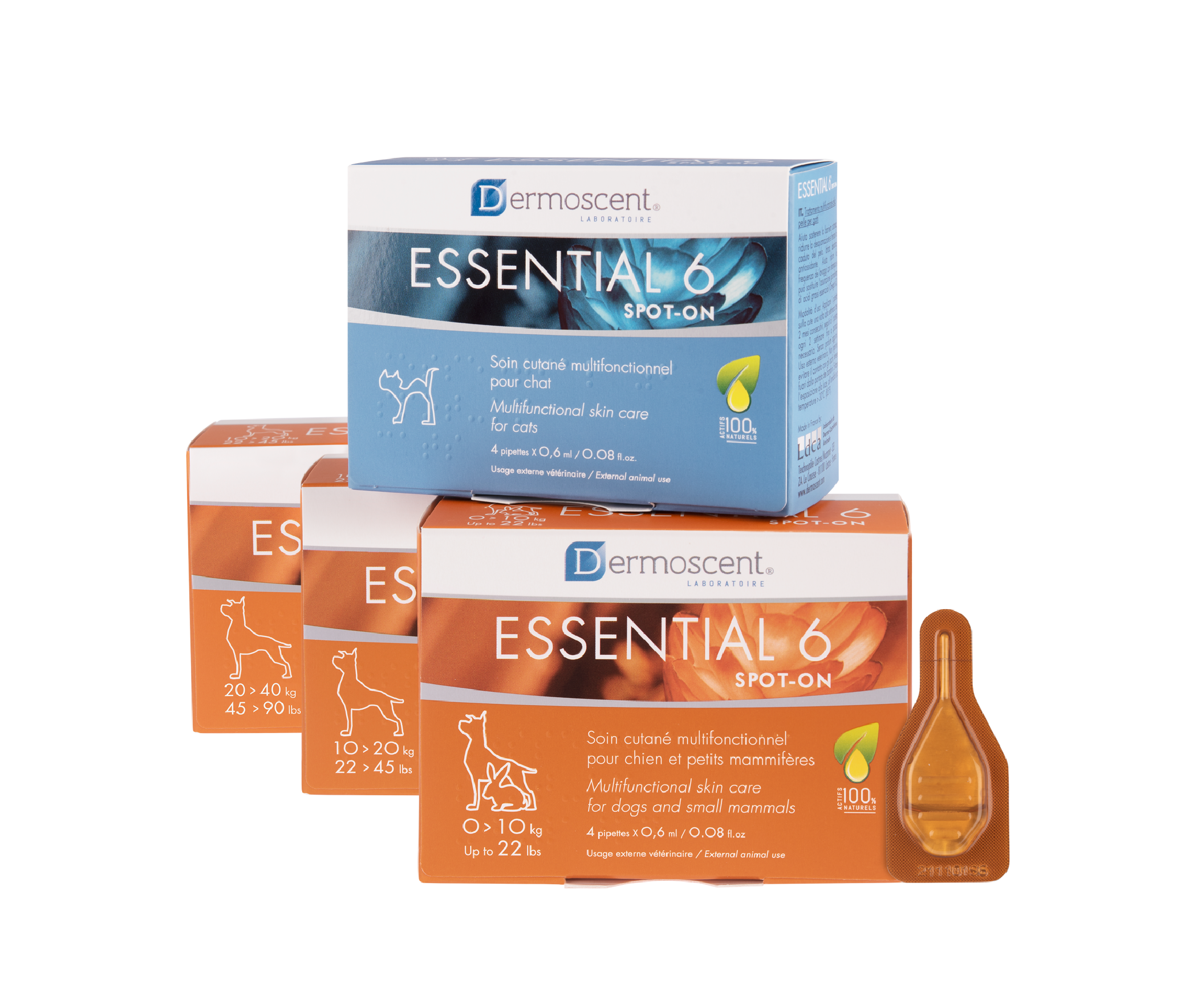 Essential 6® spot-on inniheldur omega-6 og omega-3 fitusýrur og 10 mismunandi ilmkjarnaolíur. Upptaka þessara efna í gegnum húðina reynist vel gegn flösu, vondri lykt, fitugri húð, möttum feldi og hárlosi, þó ekki árstíðabundnu hárlosi.