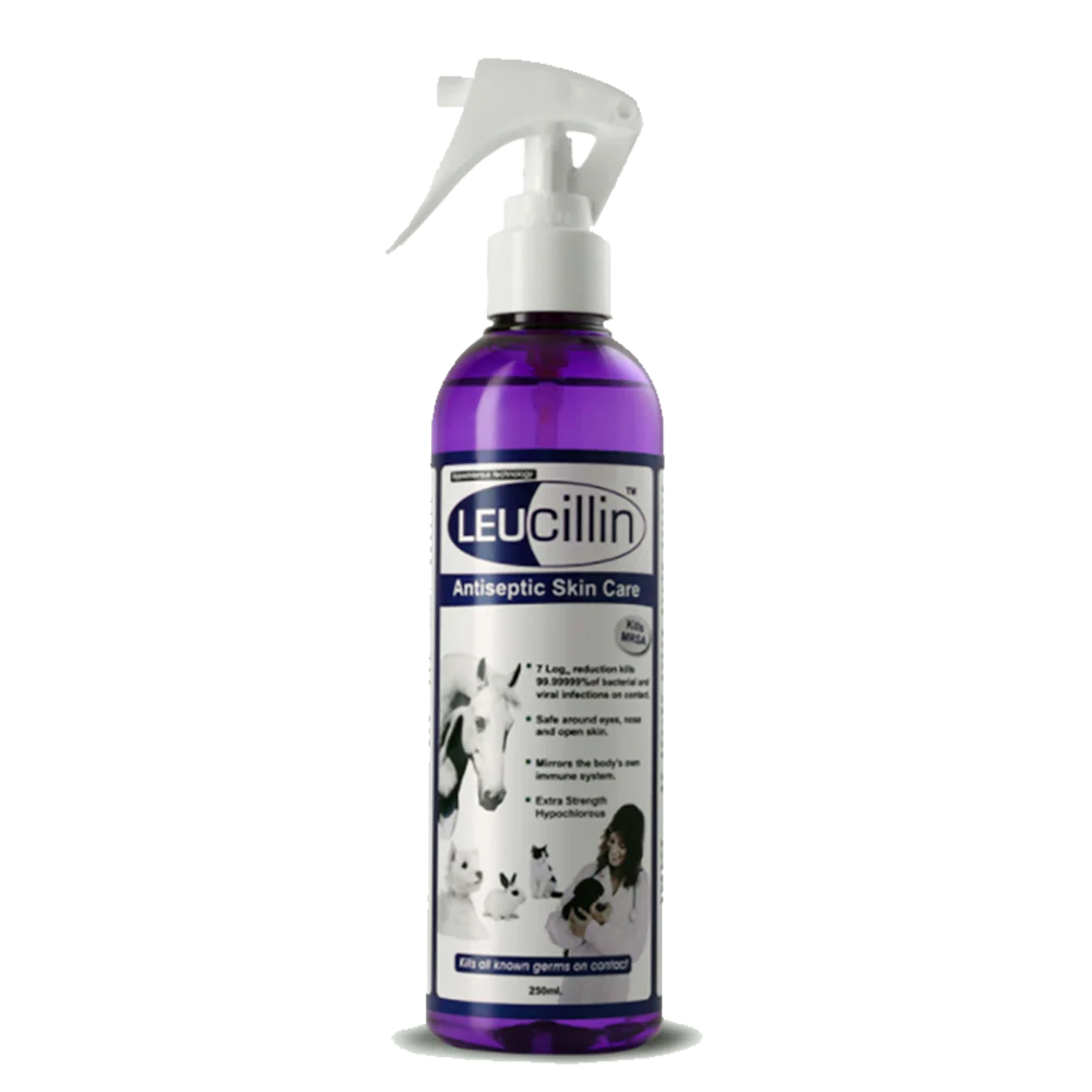 Leucillin er öflugur, eiturefnalaus og sótthreinsandi sáravökvi án ertandi efna sem má nota á öll spendýr. Vinnur í sátt við nátturlegar varnir líkamans með hypochlorus (HOCl) sem er náttúrulega framleitt af hvítu blóðfrumunum líkamans.
