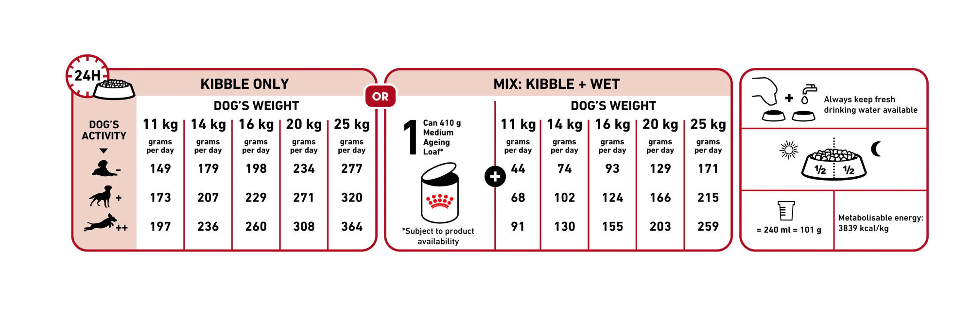 Inniheldur sérlega auðmeltanleg næringarefni fyrir hámarksupptöku. Ríkt af andoxunarefnum til þess að hlutleysa sindurefni á eldri árum hundsins.