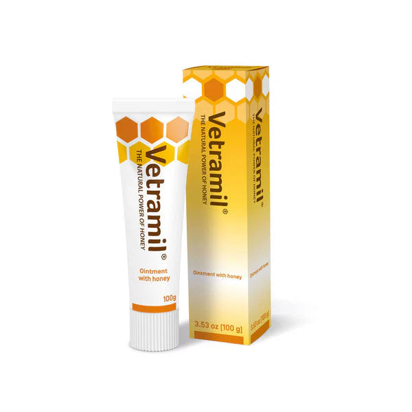 Vetramil smyrsl er mild, hunangsbundin formúla sem er hönnuð til að róa og styðja við bata hjá gæludýrum með hrjúfa, erta eða viðkvæma húð. Það er fullt af náttúrulegum ensímum, andoxunarefnum og ilmkjarnaolíum og stuðlar að heilbrigðri bata húðarinnar og verndar um leið viðkomandi svæði.