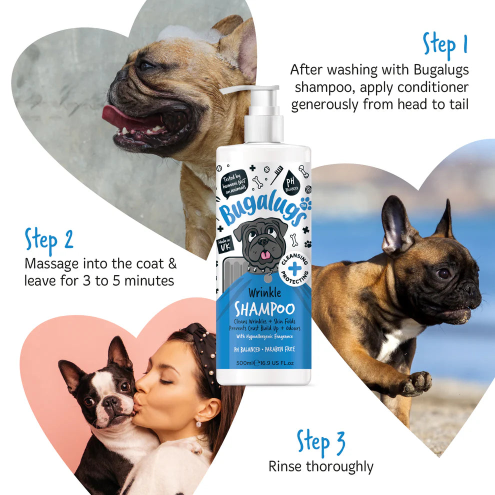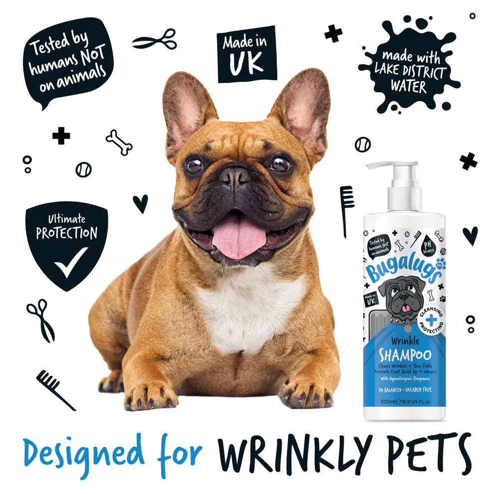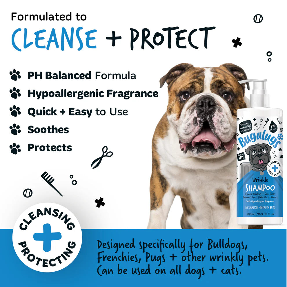 Bugalugs Wrinkle Shampoo er hannað til að hreinsa hrukkur og húðfellingar. Ofnæmisprófuð og pH-jafnvægð formúla sem hentar sérstaklega vel viðkvæmri húð og erfiðum hrukkusvæðum, en er einnig örugg fyrir alla hunda og ketti með viðkvæma húð.