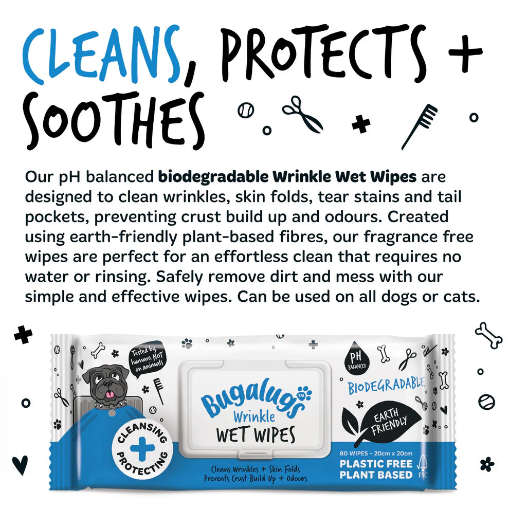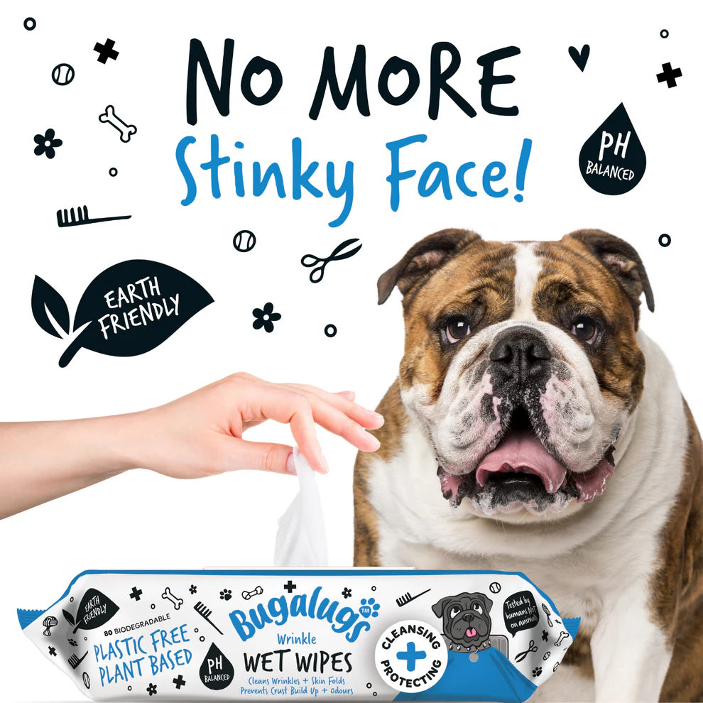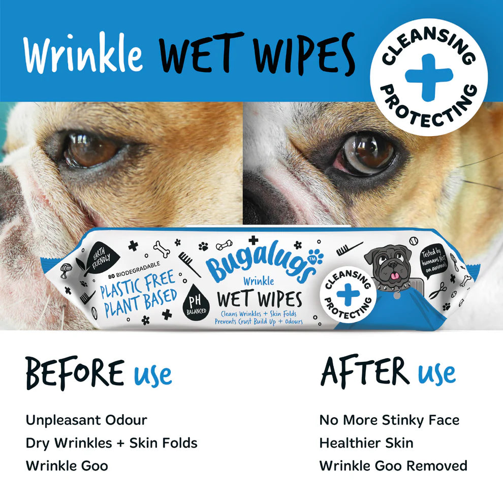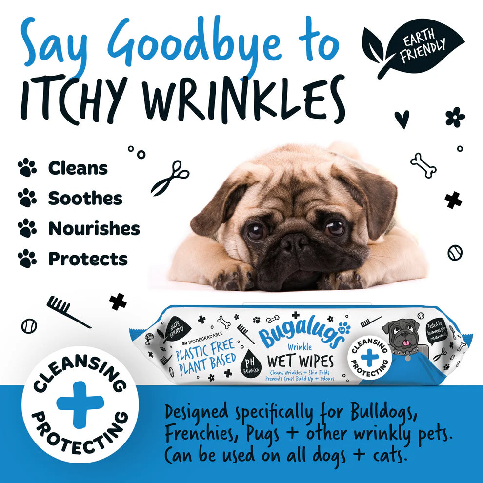 Bugalugs Wrinkle Wipes eru sérstaklega hannaðar með þarfir flatnefja hundategunda í huga, svo sem franskra bolabíta, pug og boxera, henta einnig öllum hundum og köttum. Þær hjálpa til við að halda viðkvæmum svæðum hreinum, ferskum og lausum við óhreinindi og lykt.
